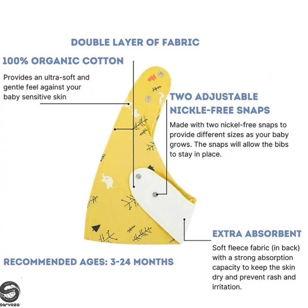 Ao contrário de outros babadores esses babadores têm um design de camada dupla para proteção extra. A camada frontal de nossos babadores de algodão orgânico para bebês tem uma alta capacidade de absorção que absorve rapidamente a saliva, enquanto a camada traseira é feita de fleece que evita que o fluido molhe o bebê.