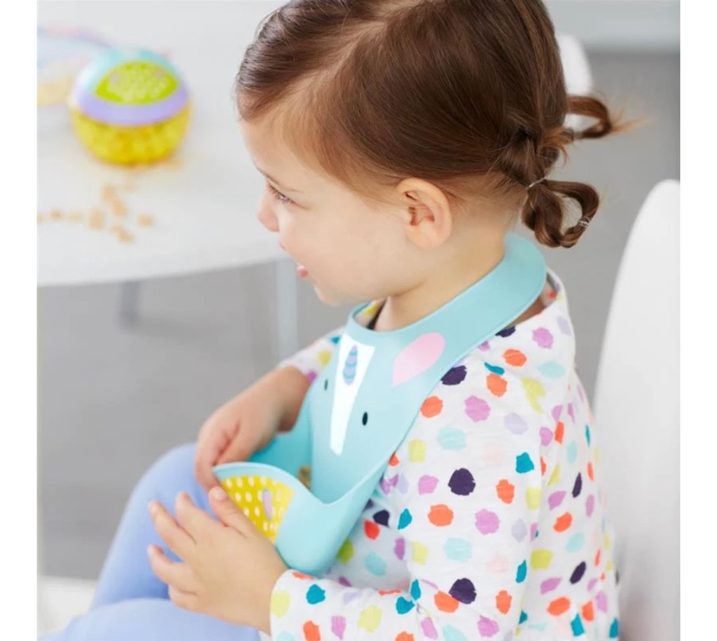 Babador Cata Migalhas de Silicone Zoo Dino da Skip Hop é muito fácil de limpar. Feito de silicone, possui um bolso fundo para recolher as migalhas e tem ajuste no pescoço para o conforto do bebê. E o melhor, se dobra facilmente, design perfeito para viagens.