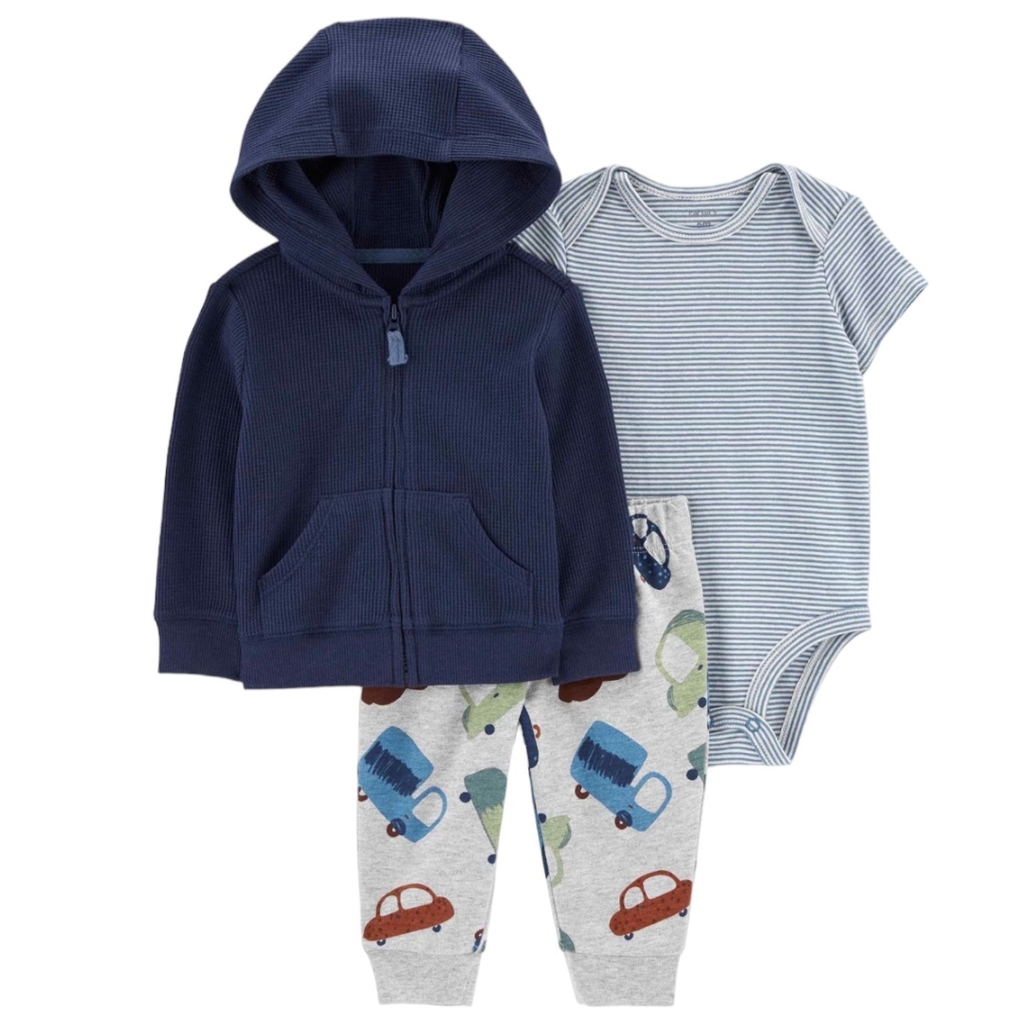 O Conjunto longo bebê 3 peças carrinhos azul Carter's é ideal para o dia a dia e esbanja fofura. Composto por um body, uma calça e um blusão com capuz. Perfeito para o cotidiano dos papais e mamães pois os itens combinam perfeitamente entre si e também podem compor outros diversos looks. Seu bebê ficará confortável e estiloso, invista!