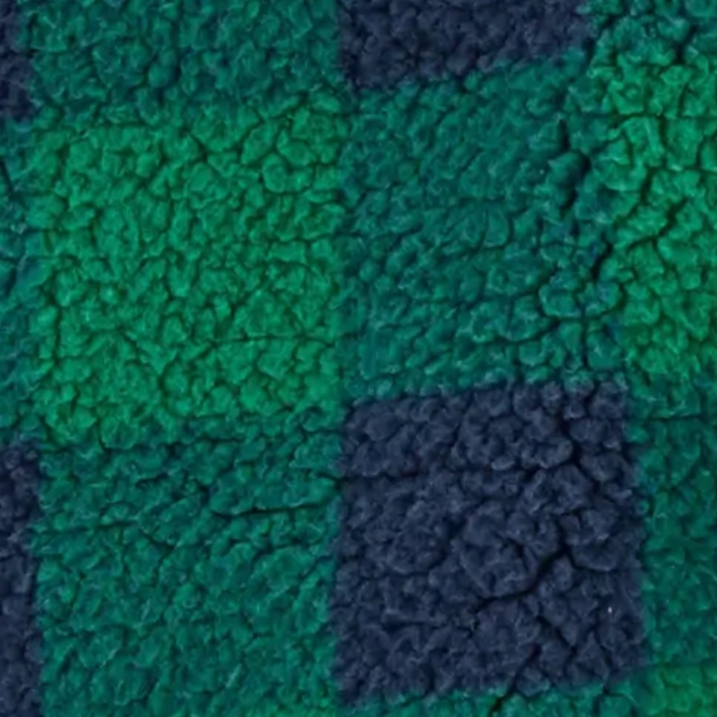 1 colete em fleece xadrez verde e azul, recortes aplicados, gola aplicada, fechamento frontal por zíper e barra canelada;