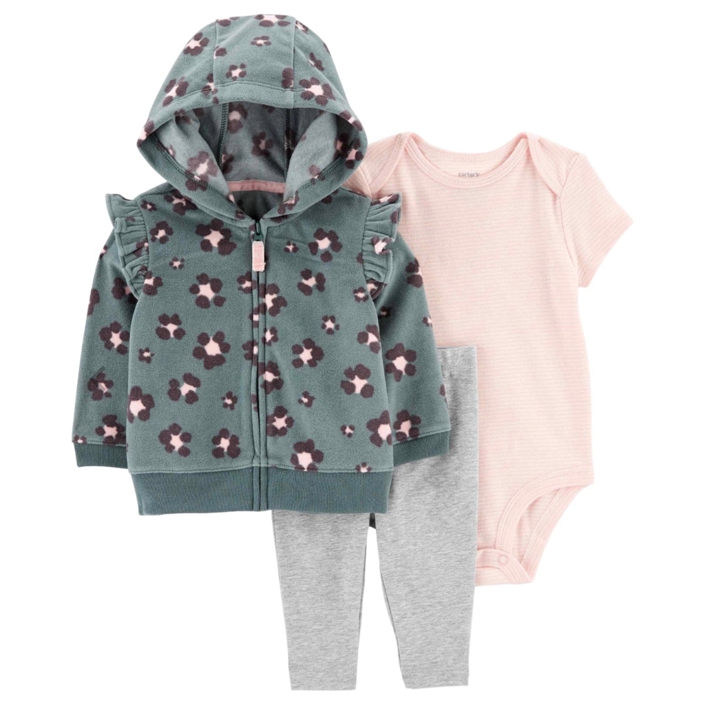 O Conjunto longo bebê 3 peças flor com animal print verde Carter's é ideal para o dia a dia e esbanjam charme e fofura. Composto por um body, uma calça e um blusão com capuz. Perfeito para o cotidiano dos papais e mamães pois os itens combinam perfeitamente entre si e também podem compor outros diversos looks. Sua bebê ficará confortável e estiloso, invista!