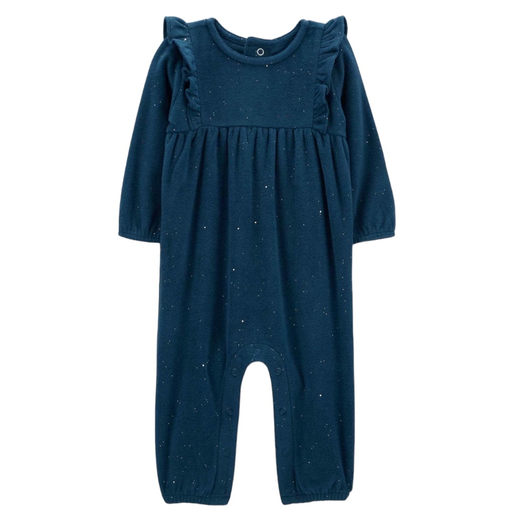 Fofo e confortável, o Macacão bebê de fleece com brilho azul Carter's confeccionado em material macio e aconchegante, com abotoamento nas costas e entrepernas, manga longa, babado nos ombros e aplicação de brilhos. É ideal para todos os momentos. O modelo esbanja estilo, invista, seu baby merece.
