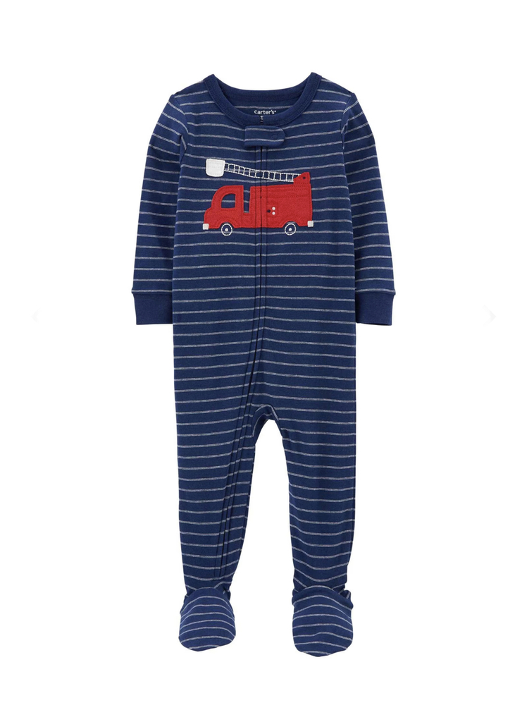 O Macacão pijama bebê listrado caminhão bombeiro |Carter's confeccionado em material macio e aconchegante, com zíper frontal que permite a abertura inversa facilitando na hora da troca de fraldas, manga longa, martingale com botão de pressão que protege o bebê do zíper, estampa listrada e patch de costurado na peça. É ideal para todos os momentos. O modelo esbanja fofura e delicadeza, invista, seu bebê merece.